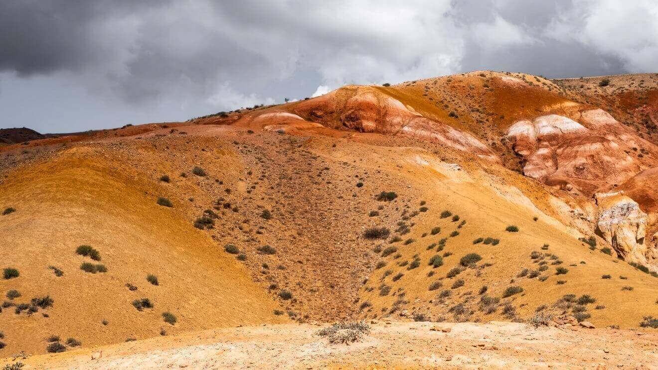 Разноцветные «марсианские» горы долгое время были скрыты под водой и когда-то относились к чаше реликтового Чуйского озера. За необычную окраску местность часто сравнивают с ландшафтом другой планеты: перед вами — палитра оттенков от песочно-жёлтого до насыщенного бордового. Говорят, что здесь и сегодня можно найти окаменелые следы древней живности.